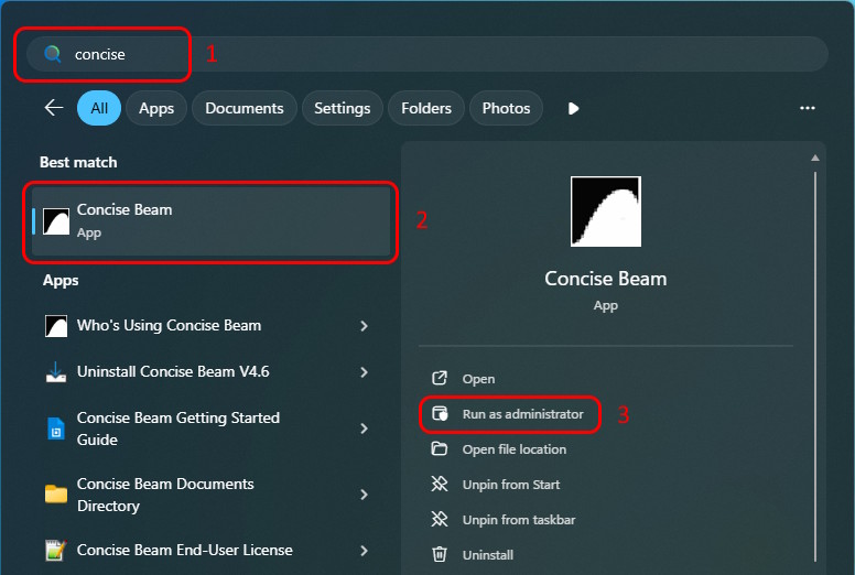 One method to do this is to open the Start Menu, search for Concise Beam, and select Run As Administrator in the list of options.