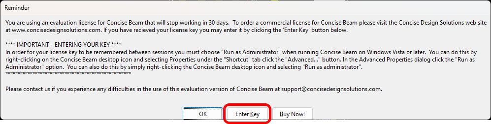 If the Reminder dialog does not appear and you would like to enter a new license key, proceed to the instructions below for How to Update Your License Key in Concise Beam.