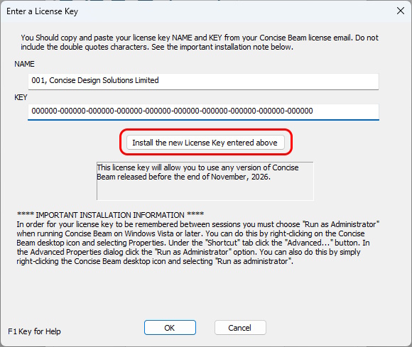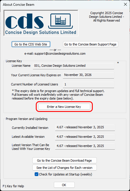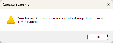 If the information was input properly and the license key is valid, Concise Beam will be switched to the new license key.